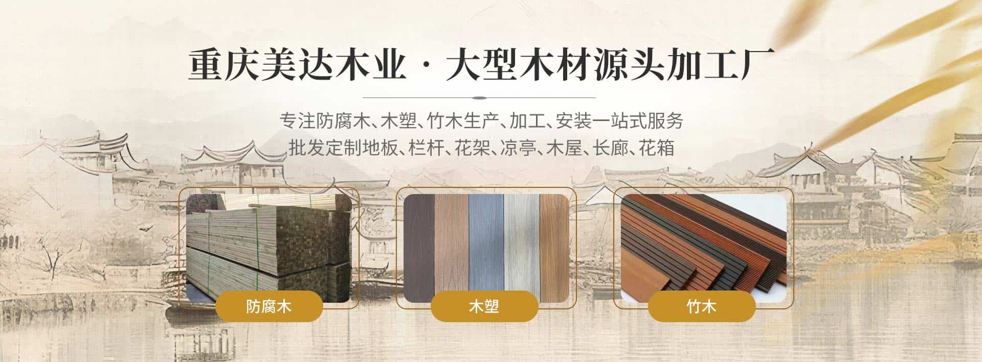 重慶美達防腐木隸屬于重慶大笨熊有限公司,大型防腐木源頭加工廠。工廠專注防腐木生產,加工20年,年產5萬立方。專業提供防腐木材料批發,防腐木工程,仿古木建筑,木屋建造,木棧道,木長廊,塑木地板,竹木(重竹)地板,枕木,戶外木地板,花架涼亭等設計,安裝一站式服務,工廠直營,量大從優,保障您的工期! 工廠擁有先進的加工設備,主要:進口臺灣四面木工刨床、美國全自動切割鋸、國內最先進的18米全自動大型拼方機、無限長(連續)指接機、可生產4500mm*1200mm*18000mm木梁、世界先進水平的木屋數控鉆孔開槽自動線,工廠與俄羅斯及加拿大3處林場,達成合作開發協議,年保證5萬立方米原木供應,為企業長遠發展奠定了基礎。